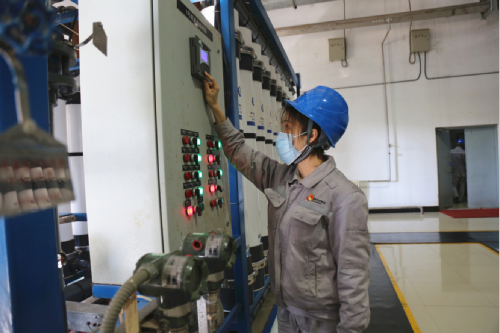 图为邹乐鸿正在检查设备运行状态