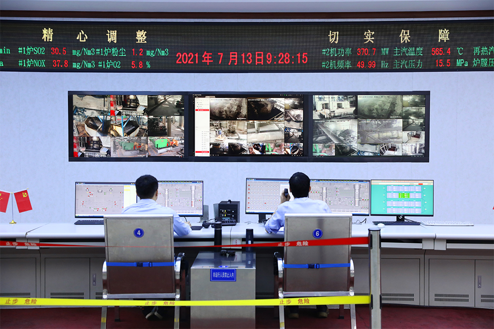 图为在宝庆电厂集中控制室,运行值班员刘帅、陈伟正在监盘。