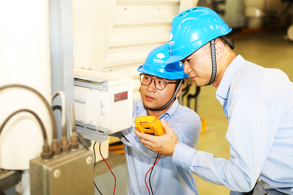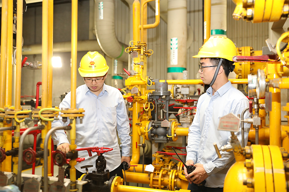 图为宝庆电厂发电运行部巡检员颜庆江、刘棵正在车间里调节氢侧密封油压差